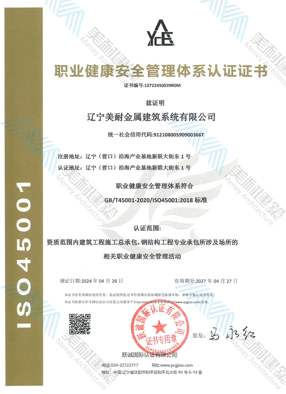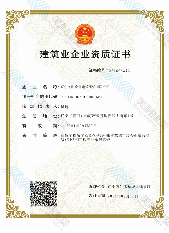 遼寧美耐金屬建筑系統(tǒng)有限公司位于遼寧(營口)沿海產(chǎn)業(yè)基地,專注于預制金屬建筑系統(tǒng)領域,是一家集工業(yè)建筑設計、制作、施工及相關的技術咨詢與服務為一體的綜合性服務企業(yè)。作為國家鋼結構協(xié)會會員、中國建筑金屬結構協(xié)會會員單位與國家高新技術企業(yè),美耐建筑集建筑工程施工總承包、鋼結構工程專業(yè)承包等多種資質于一身,并擁有22項鋼結構建筑領域專利,9項軟件著作權。